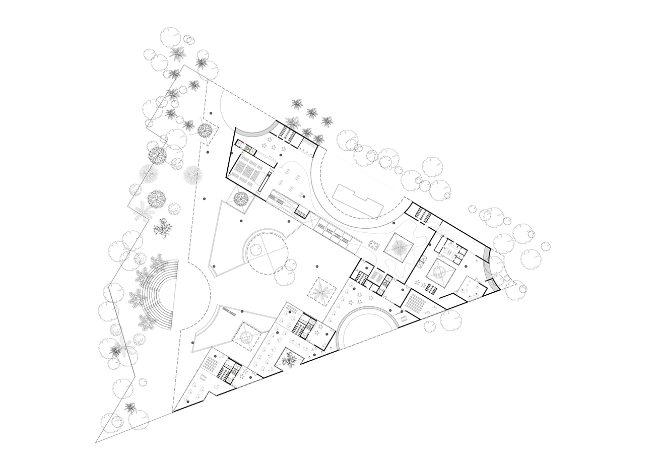 c. The first level is entirely removed to allow the flow of air and light as well as the intrusion of the Botanical Park inside the core of the building.