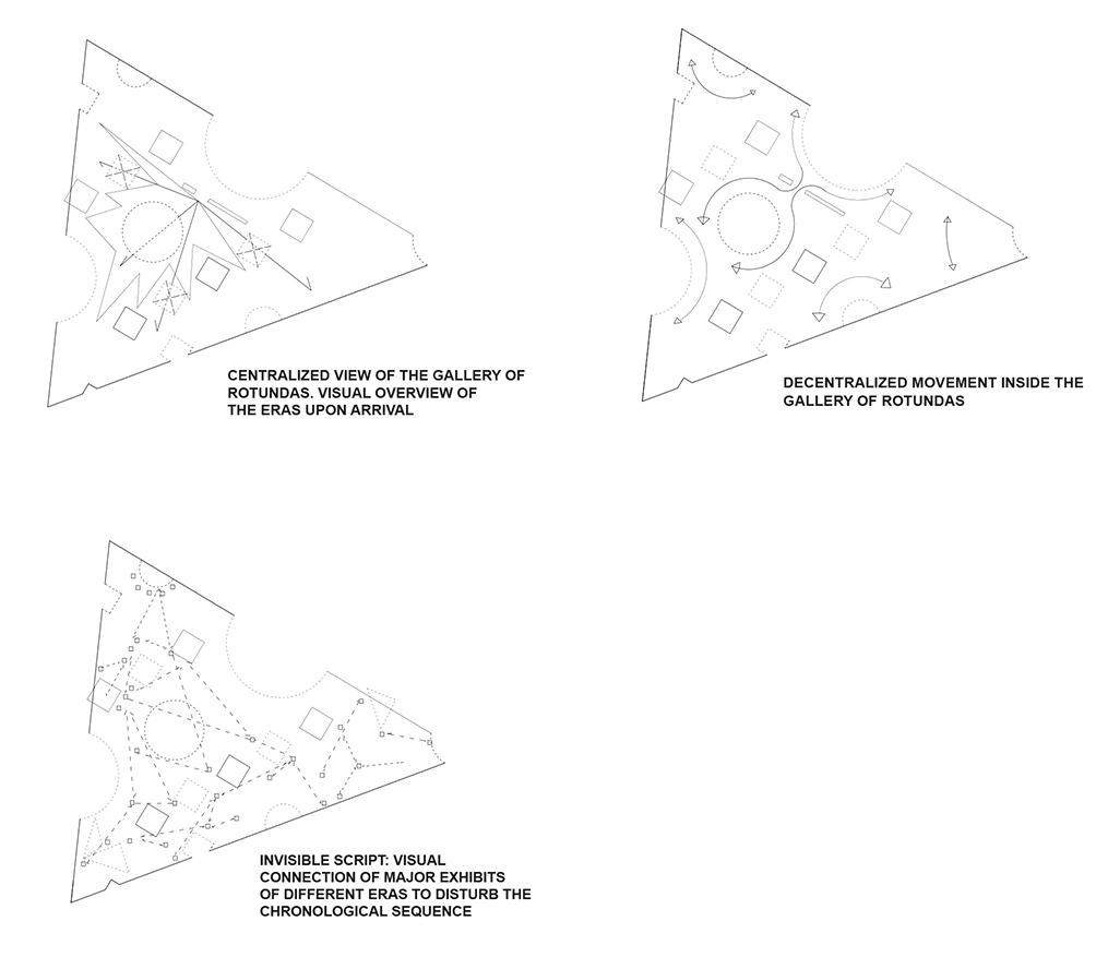 Concept for the Permant Exhibitions: Centralized & Decentralized, Formal & Informal 'Galleria of Rotundas'. The exhibition space is divided by three.