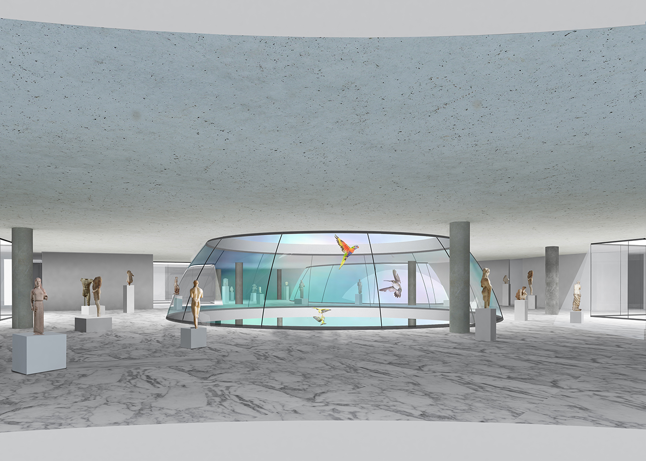 Antiquities are exotic and curious. The proposed New Cyprus Museum avoids showcasing them as found objects. It performs a place of curiosities in juxtaposing relations, combining exhibition spaces and a Botanical park of the rare and endangered endemic flora of Cyprus. The entire site is treated as a single environment to equally host visitors, staff, researchers, trees, flowers, and passengers that are simultaneously omnipresent, following the example of the very first Museum of Alexandria that combined collections, library, botanical gardens and a zoo for observation. The Museum performs a City – Cabinet of curiosities within the city of Nicosia.