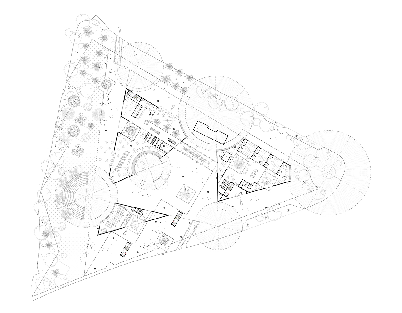 a. Six spherical voids formulate the six plazas that receive people from all possible directions connecting the site with the adjacent park, the river, the public buildings and the city.