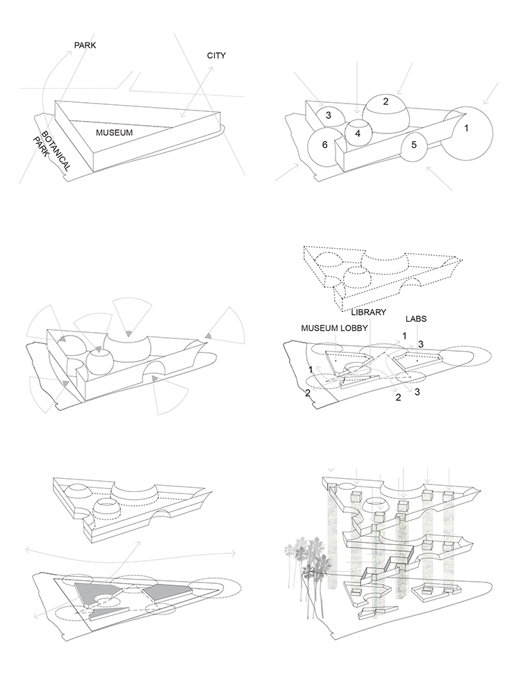 d. The second and the third floors are treated as a single volume with double height, to be further cut into a zig-zag solid for the purpose of providing the offices of the Museum staff and of the Administration of Antiquities with maximum view toward the intrusive Botanical Park. The people who work at the Museum actually habituate a hovering 3 dimensional cavity–park.