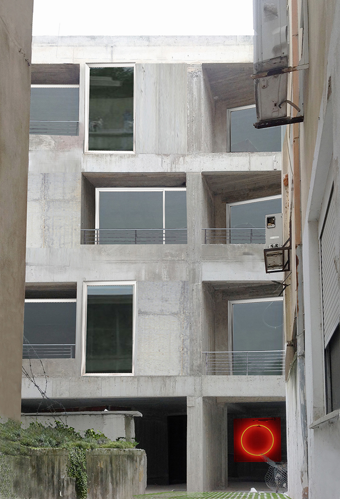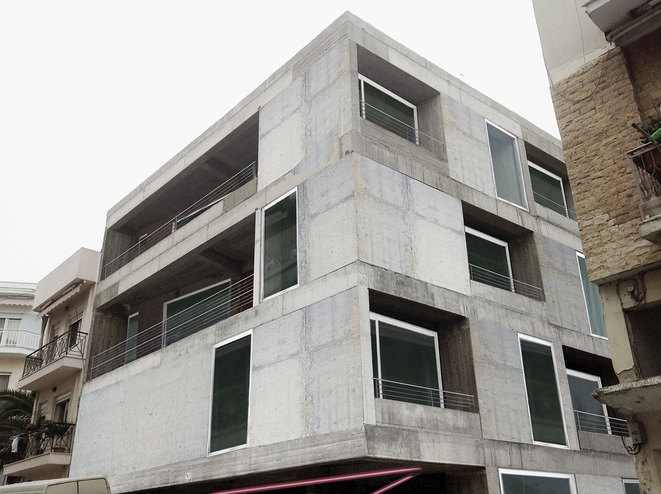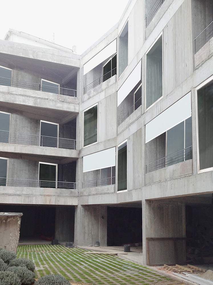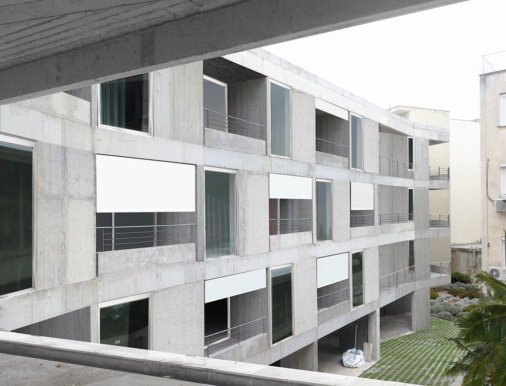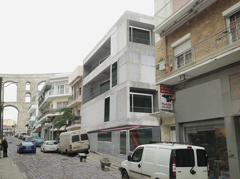 The apartment building is located inside the historic center of Kavala. In close proximity, there can be found the 16th century aqueduct —namely ‘Kamares’ which means ‘arches’—, the ottoman neighborhood, the castle, tobacco storage buildings (the city’s traditional industry dating since the early 19th century), new buildings and a small beach, where wooden boats are still being manufactured. Houses, landmarks, workspaces, past and living history, and nature pack against each other, to fit. The L-shaped and thin site is located at the very core of this density; only one narrow side of the plot can be seen from the street. The building follows the thin geometry and the shape of the site, pretending a wall with the thickness of apartment. The facade of the building is continuous to serve its long shape. The placement of large windows reproduces the ‘uncertain certainty’ that lies within the coexistence of the strict structural order of neighboring tobacco buildings and of the aqueduct with the disordered placement of all kinds of buildings around them. Each apartment has large windows that open toward essentially fragmented views of the environment and of itself; the framed views never focus on a single theme, reminding of kaleidoscopic glimpses and revealing the structural rule of the city, order & chaos.