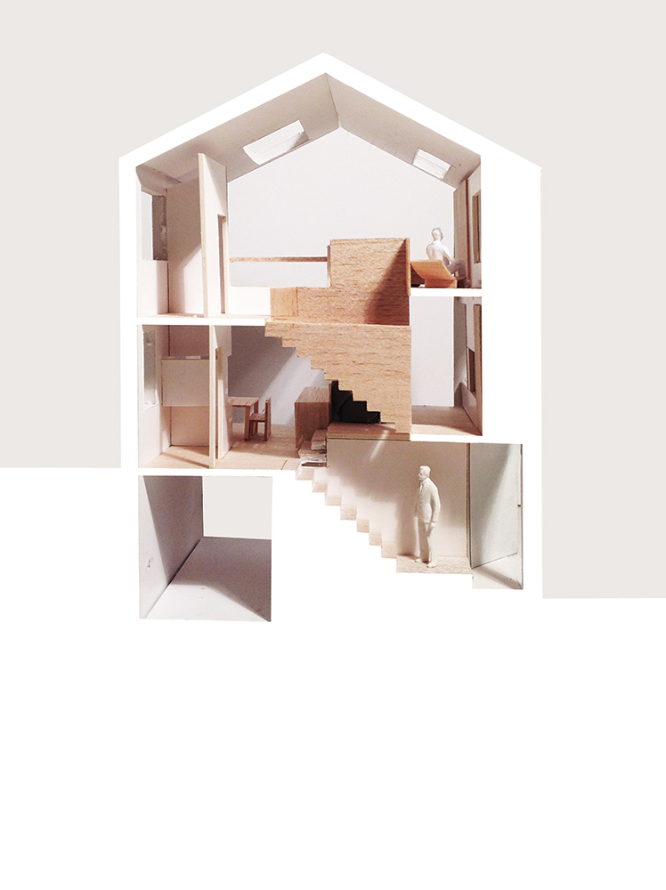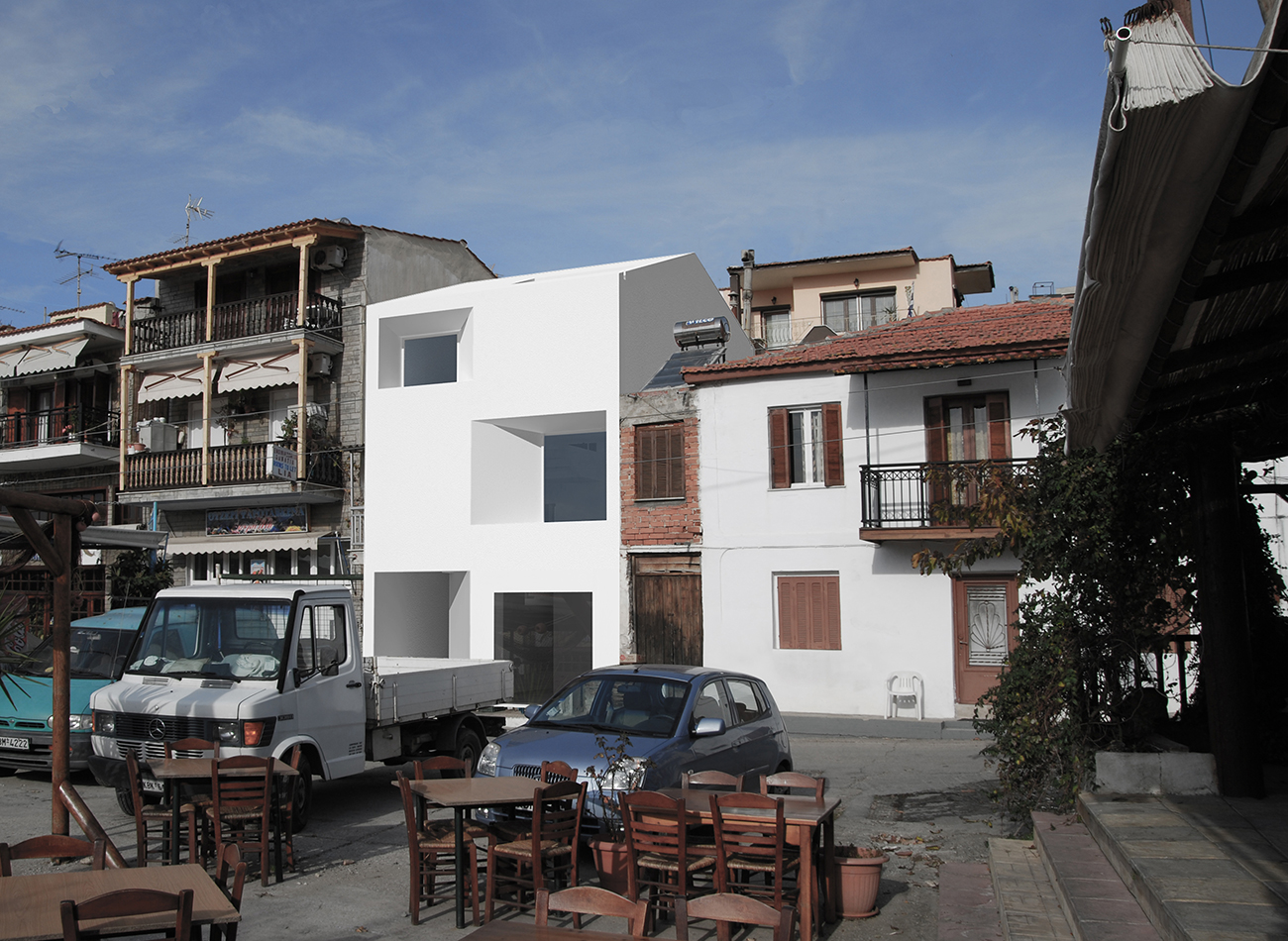 The program includes house and store, while the buildable area is 60 square metres. The major concern was to befool restrictions and create large areas and unexpected comfort. The building combines a small store on the ground floor and a two-storey-one-bedroom apartment on the first and second floors. The two entrances are kept apart by an inclined wall. Given the very limited buildable area, the front facade is multifunctional: