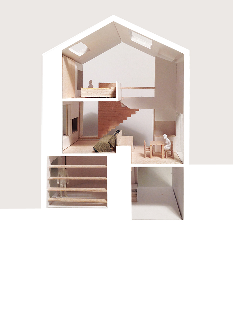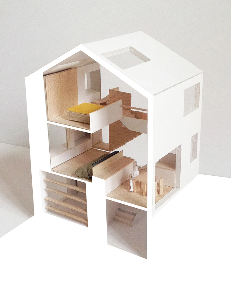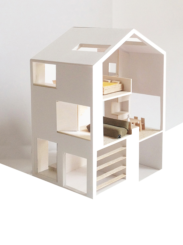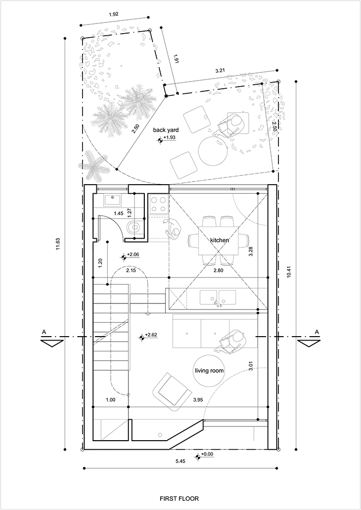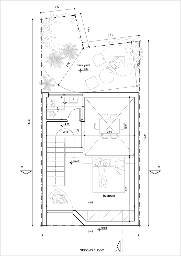 The interior of the house lacks enclosures for the purpose of maximizing and extending the perceptive boundaries of the unavoidably small living areas. Kitchen, living room and bedroom are distinct, yet they are kinesthetically and visually connected, providing the most possible depth at all standing points and maximum possibilities for natural ventilation.