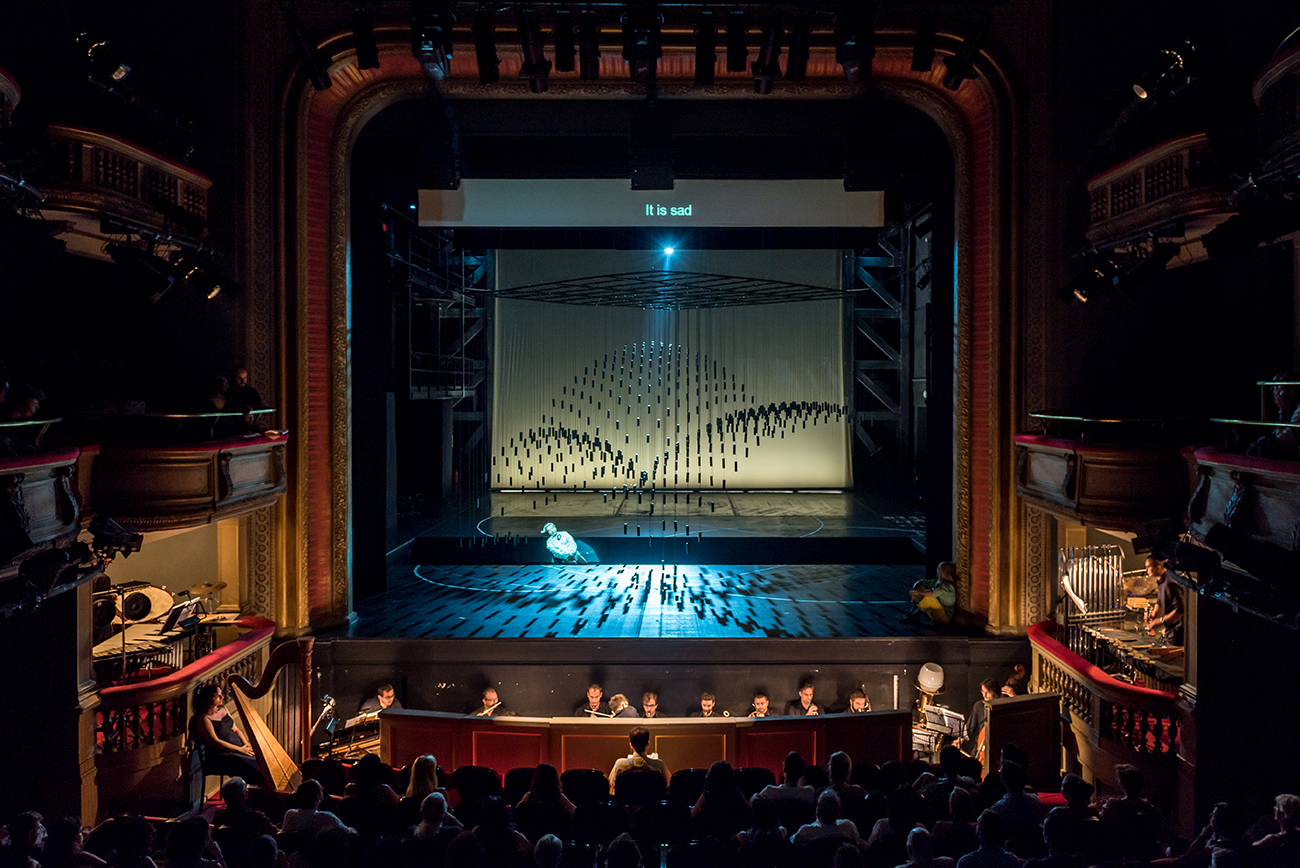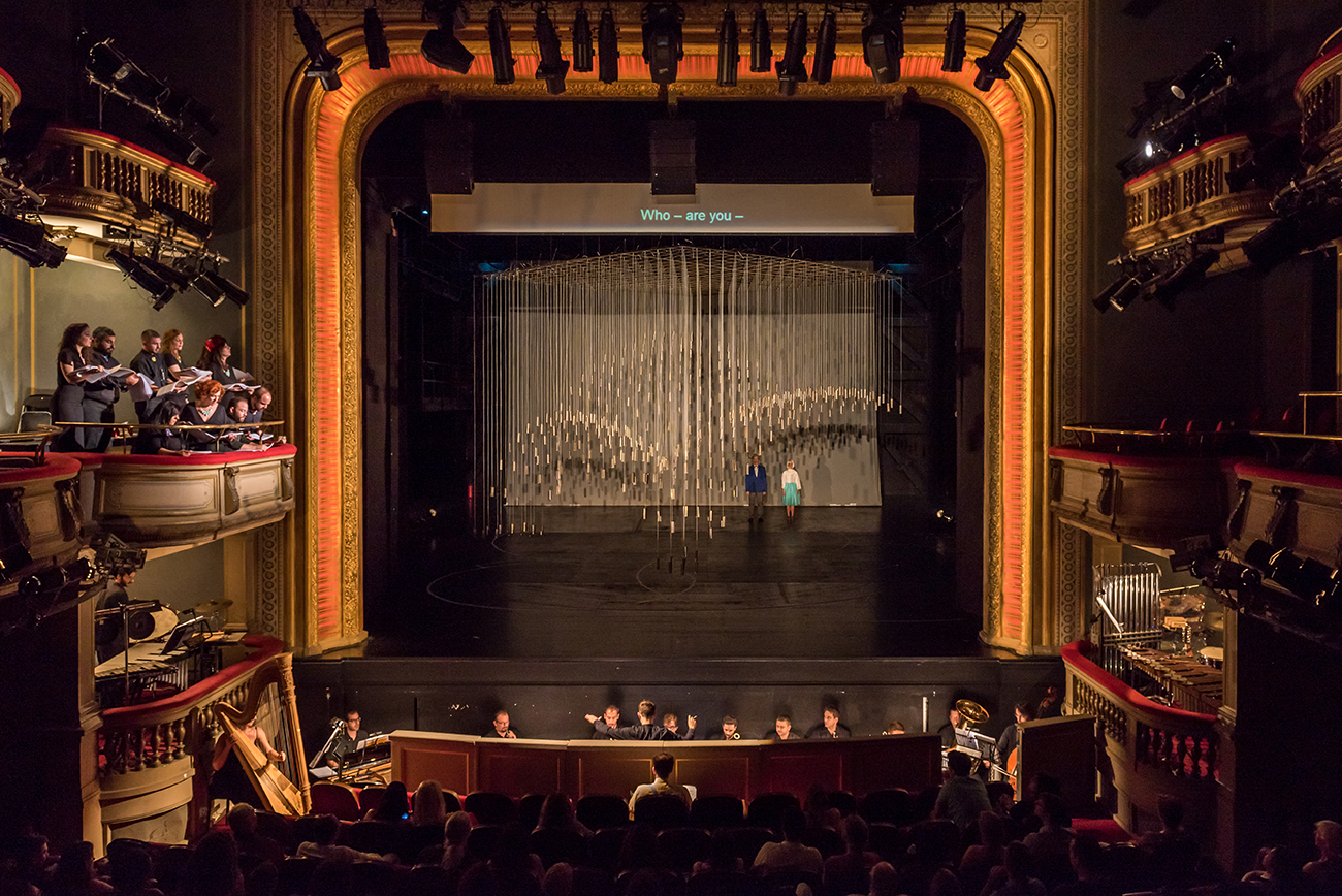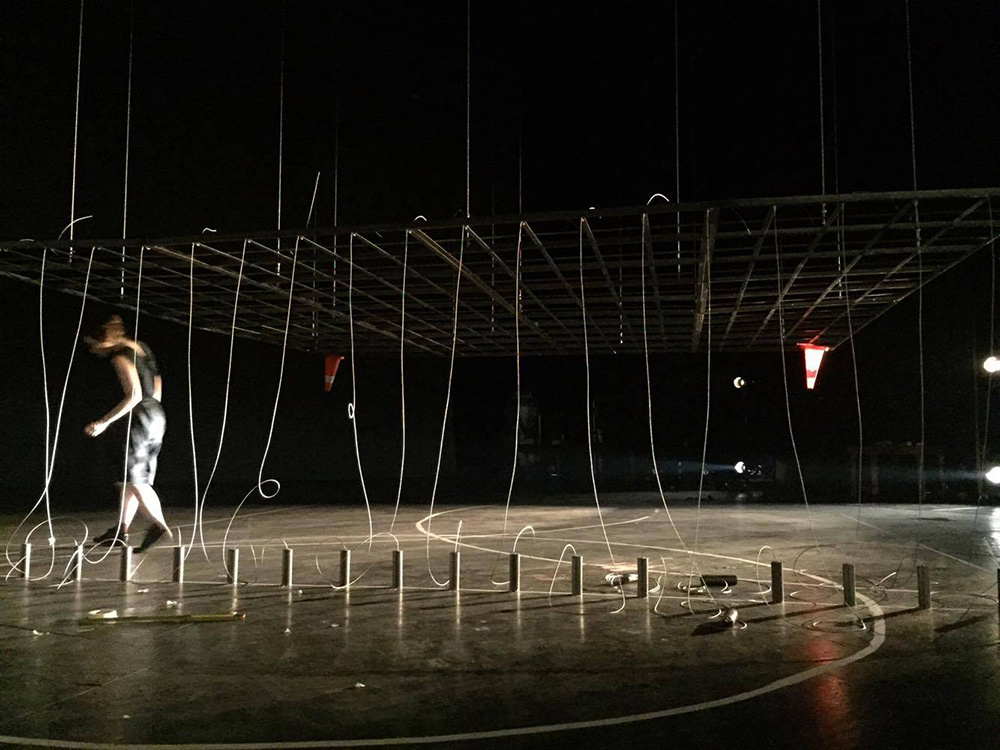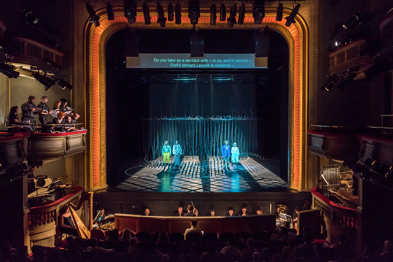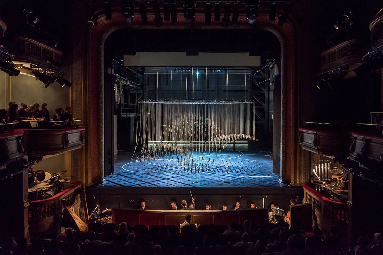 The set for Georg Buchner’s opera Leonce and Lena is a cubical volume, standing above the ground. Its mass is made out of 530 vertical metal strings carrying metal weights and hanging from a metal frame. Three spherical volumes are extracted by the cube, formulating the rooms where the opera is played. The structure moves vertically to create diverse environments and to function as musical instrument every time the weights gradually touch the ground. The installation attempts to be simultaneously garden-sky-musical instrument-jail-dome-forest–church-mass & void, with much uncertainty and abstraction.