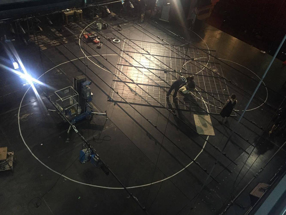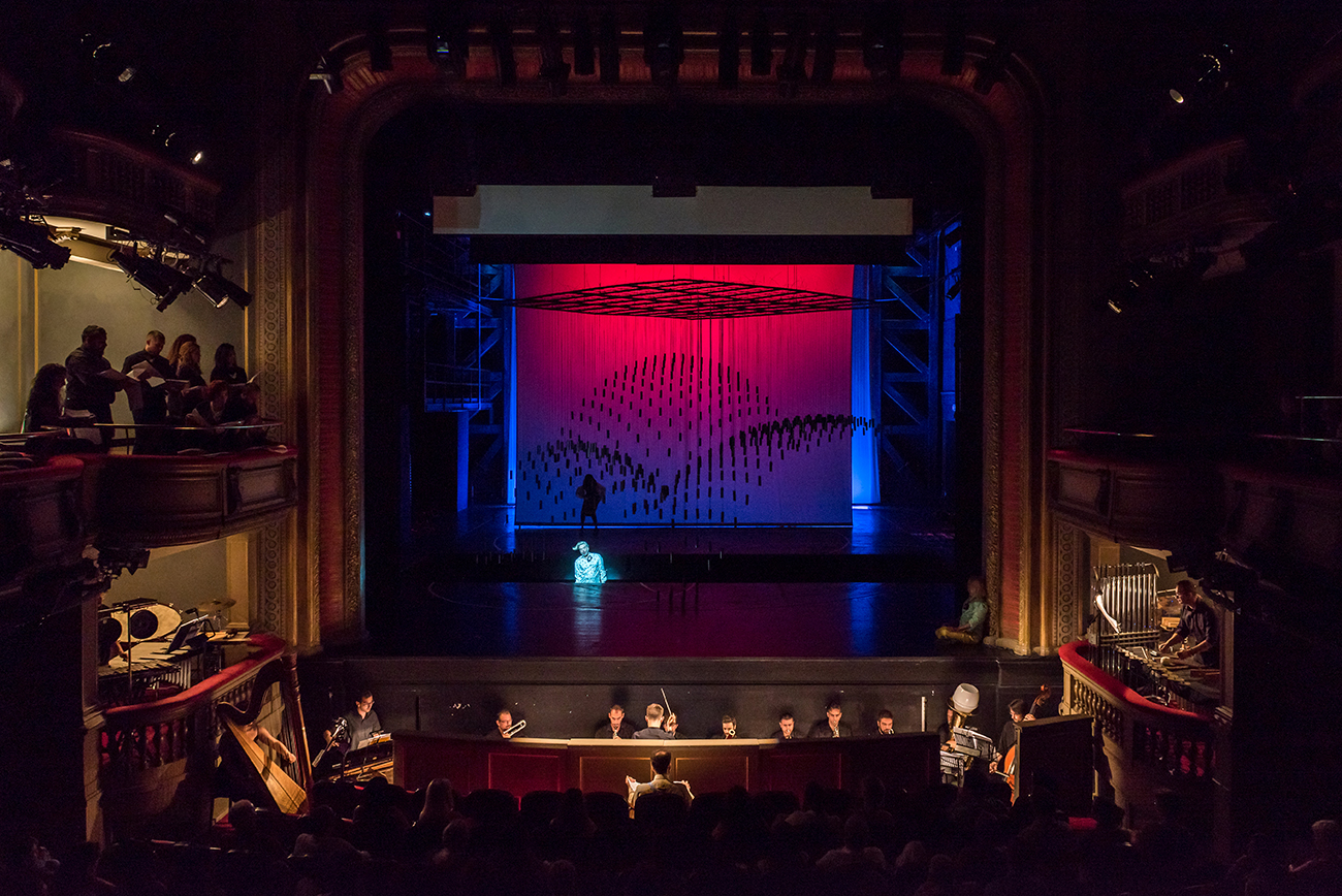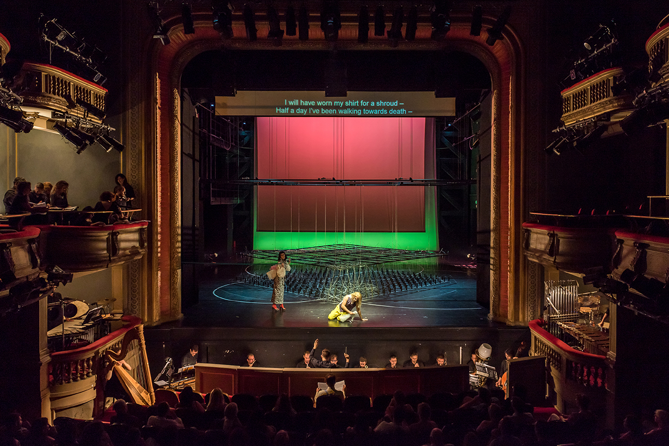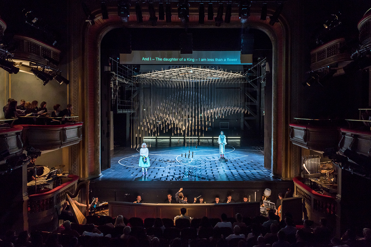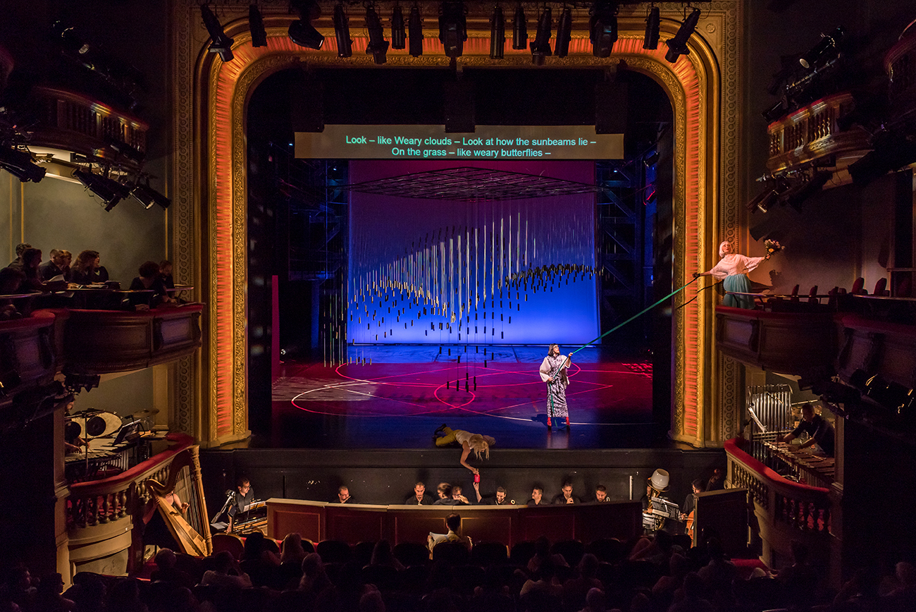 The set for Georg Buchner’s opera Leonce and Lena is a cubical volume, standing above the ground. Its mass is made out of 530 vertical metal strings carrying metal weights and hanging from a metal frame. Three spherical volumes are extracted by the cube, formulating the rooms where the opera is played. The structure moves vertically to create diverse environments and to function as musical instrument every time the weights gradually touch the ground. The installation attempts to be simultaneously garden-sky-musical instrument-jail-dome-forest–church-mass & void, with much uncertainty and abstraction.