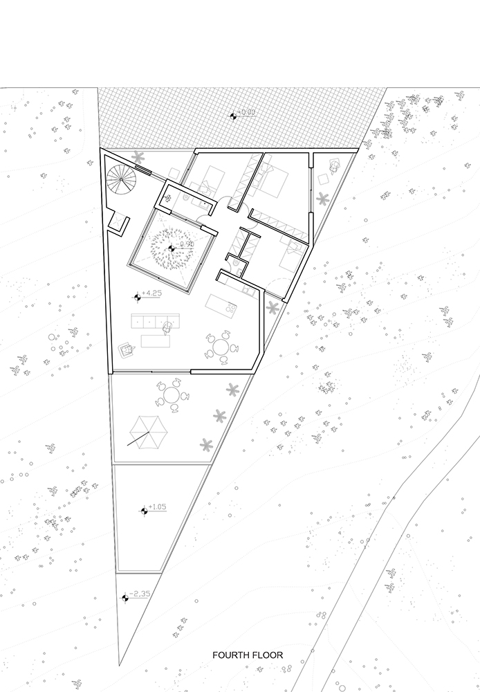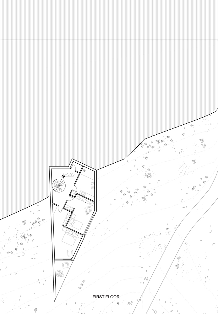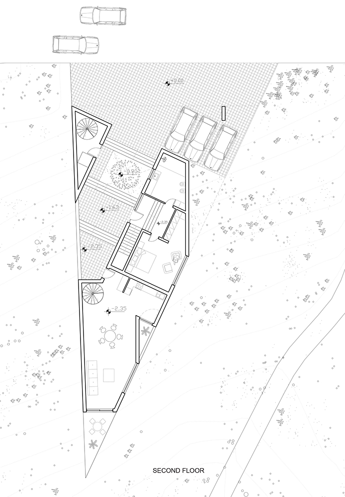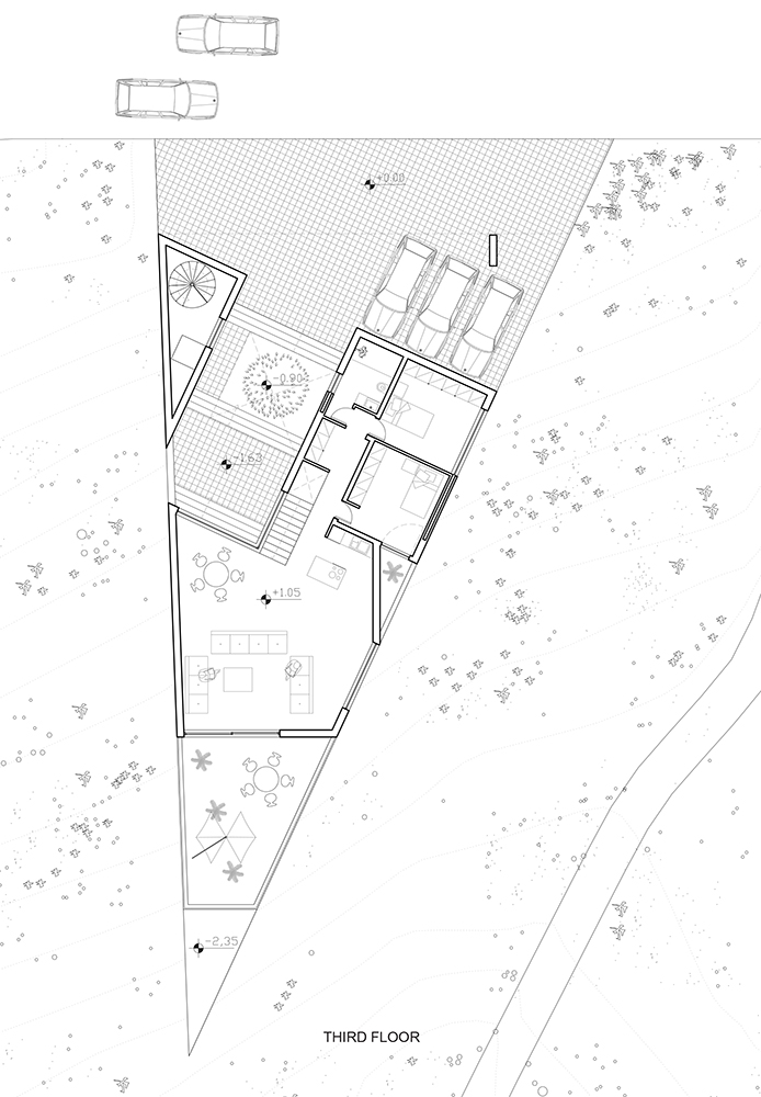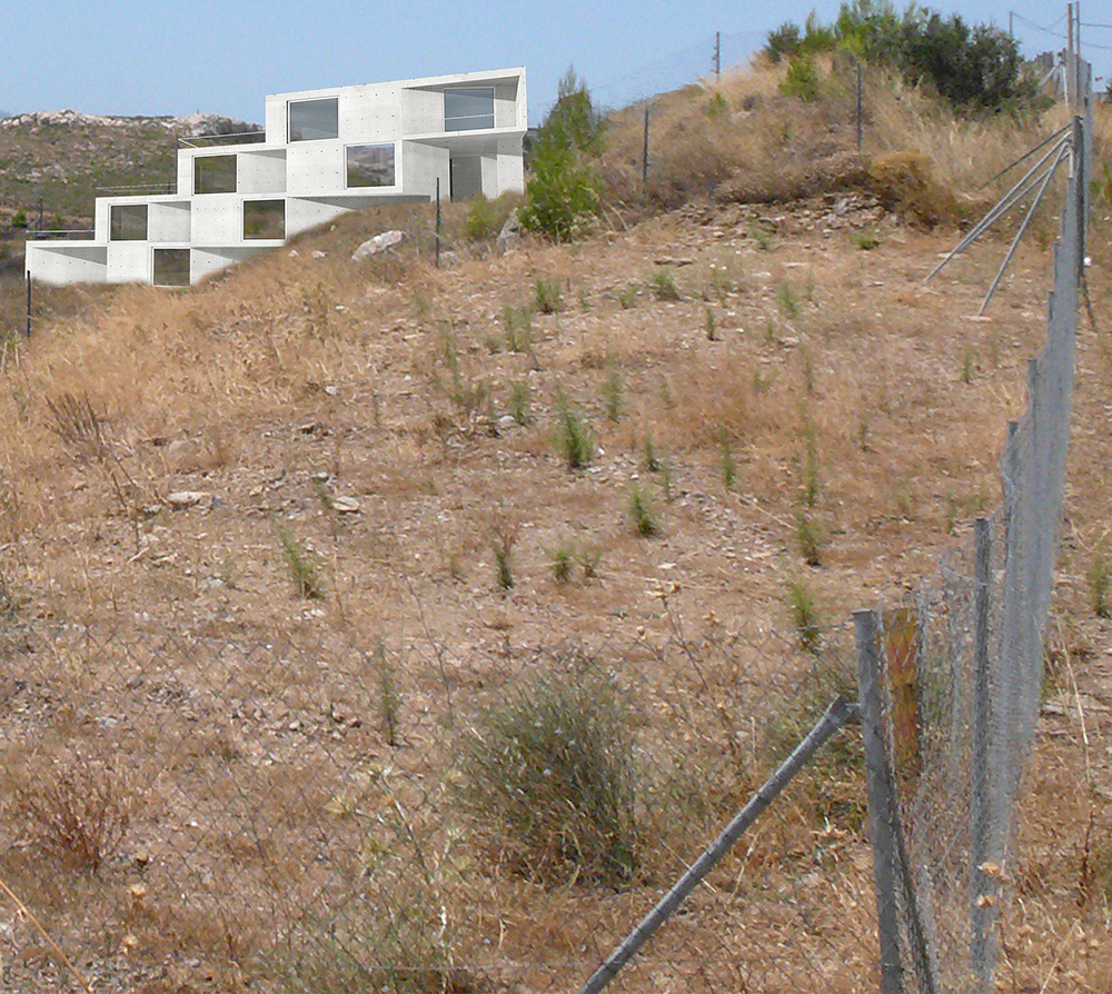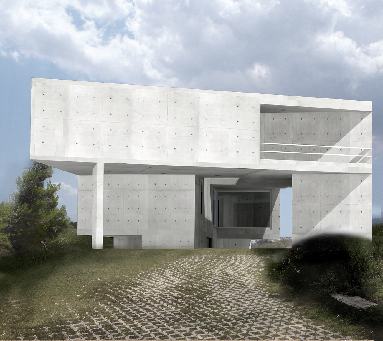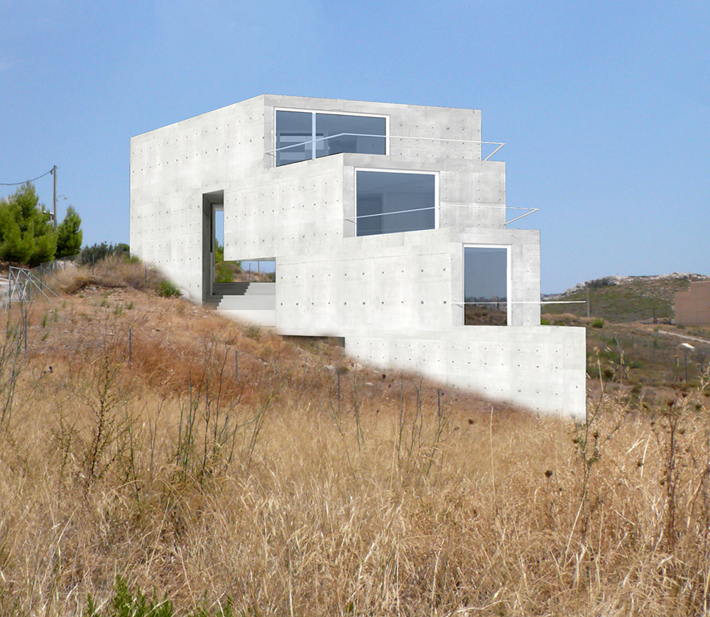 The building is inclusive of three apartments of equal size and facilities for the families of three brothers, yet with diverse plans to satisfy their distinct idiosyncrasies. The building descents the hill in analogy to a stair. Large verandas face the distant view of the sea. The entrances of the houses are individual and are located inside the equally descending negative void of the building’s volume. The ground floor inside the cavity-entrance follows the natural slope. An atrium fills it with unexpected light. The facades of the building are designed to serve the concept of ‘camouflage’; moving around the building equals gradual recognition of the transformation of the building from blindness and enclosure towards openness and exuberance.