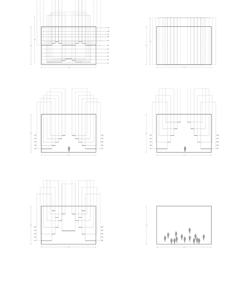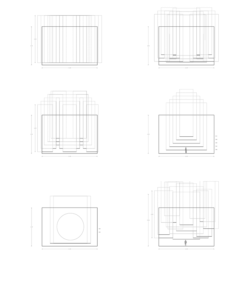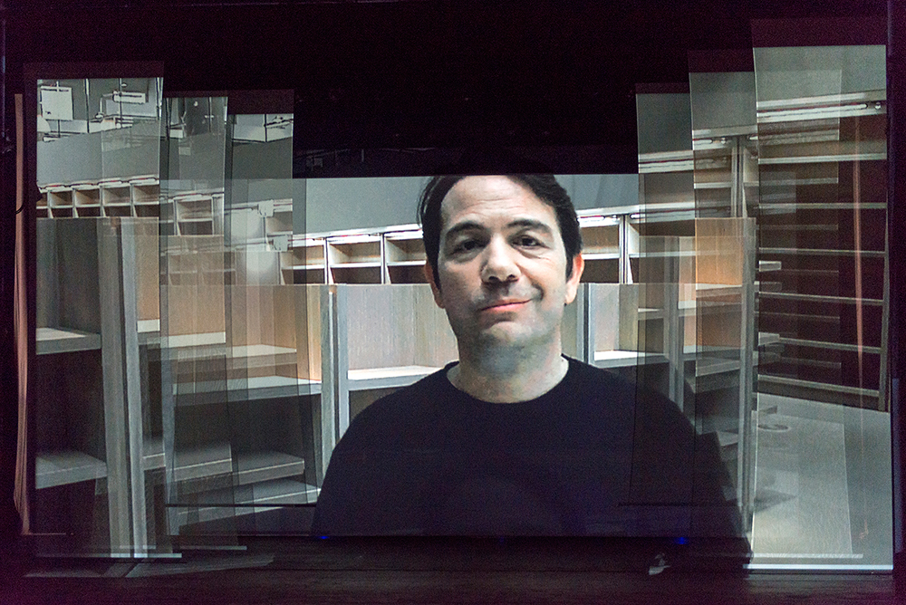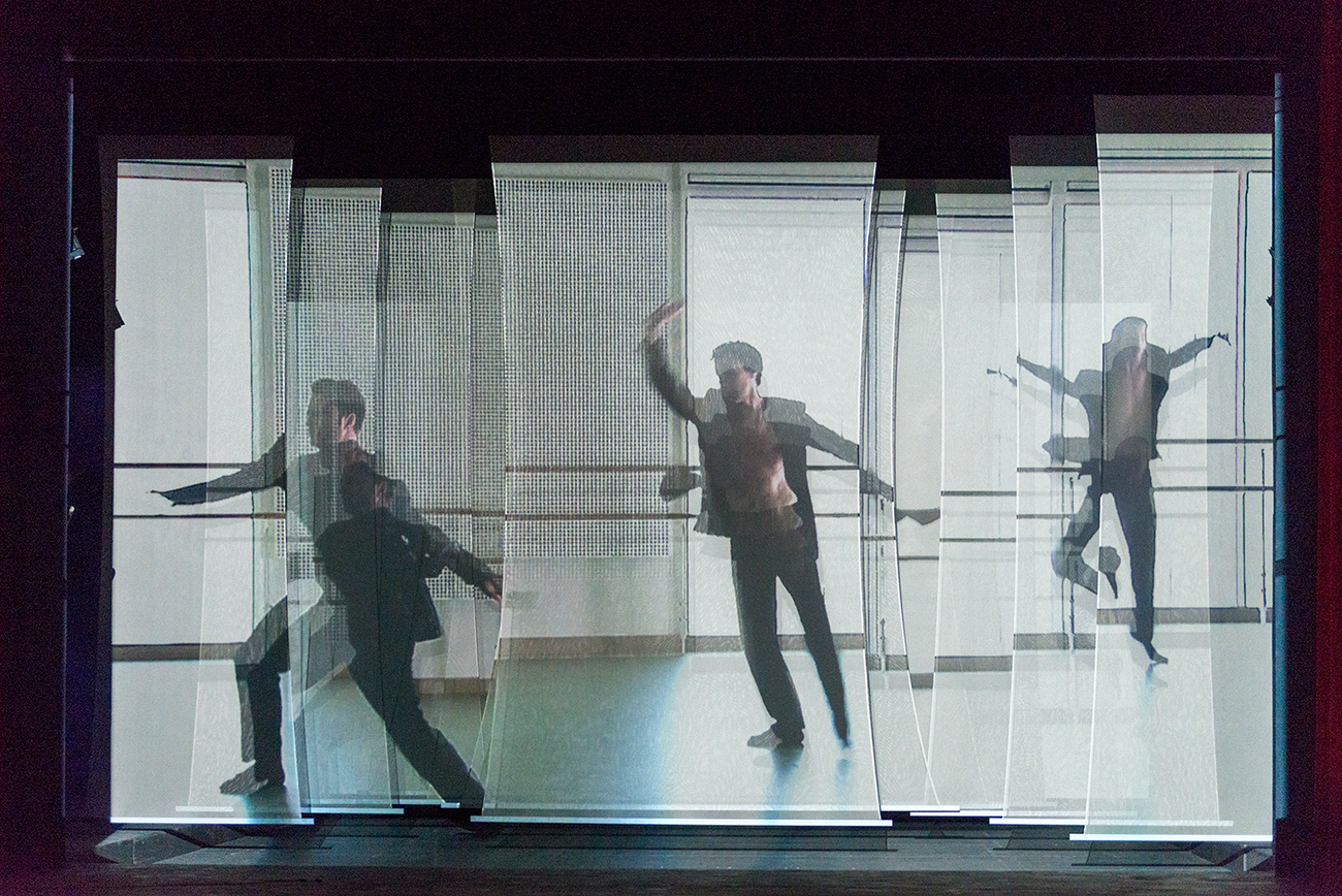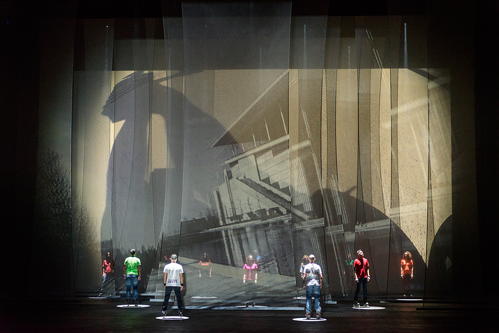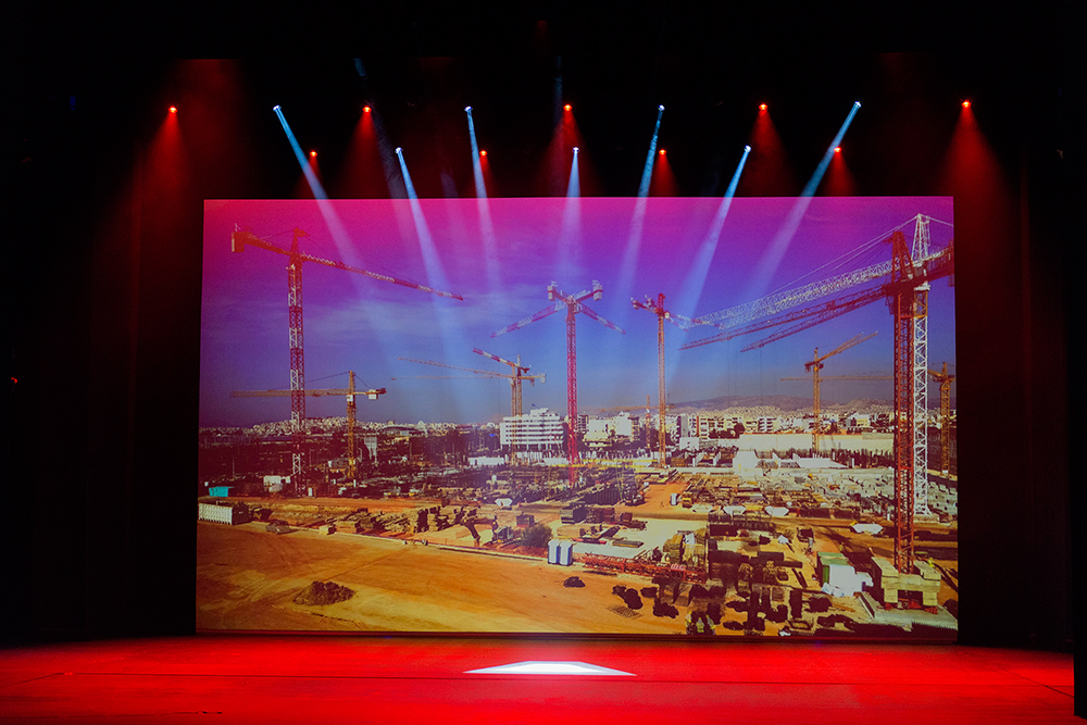 The installation consists of 15 large scale projection screens of different sizes (ten screens 5x15m, one screen 6x15m, one screen 8x15m, one screen 10x15m, one screen 12x15m) that are custom-made out of translucent fabric especially specified to allow simultaneous front and back video projection. They are placed inside the full depth of the Opera House stage, overlapping each other and therefore capturing inside their core a 3dimensional effect, the ghost image of the events that are simultaneously taking place in various areas of the Stavros Niarchos Foundation Cultural Center. Abstract volumetric holograms occur. The screens and their locations are especially designed to be individually moving vertically and therefore to be transforming every next environment that captures a completely different event.