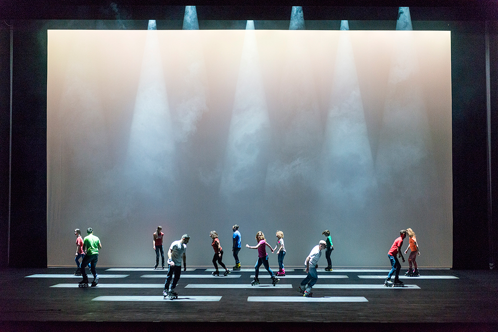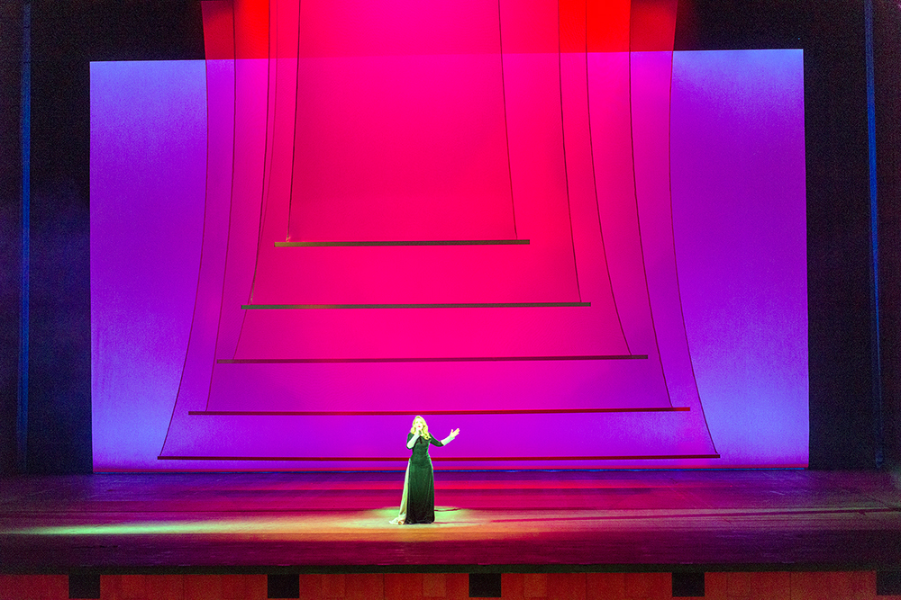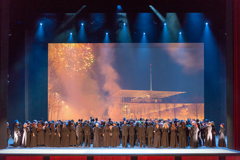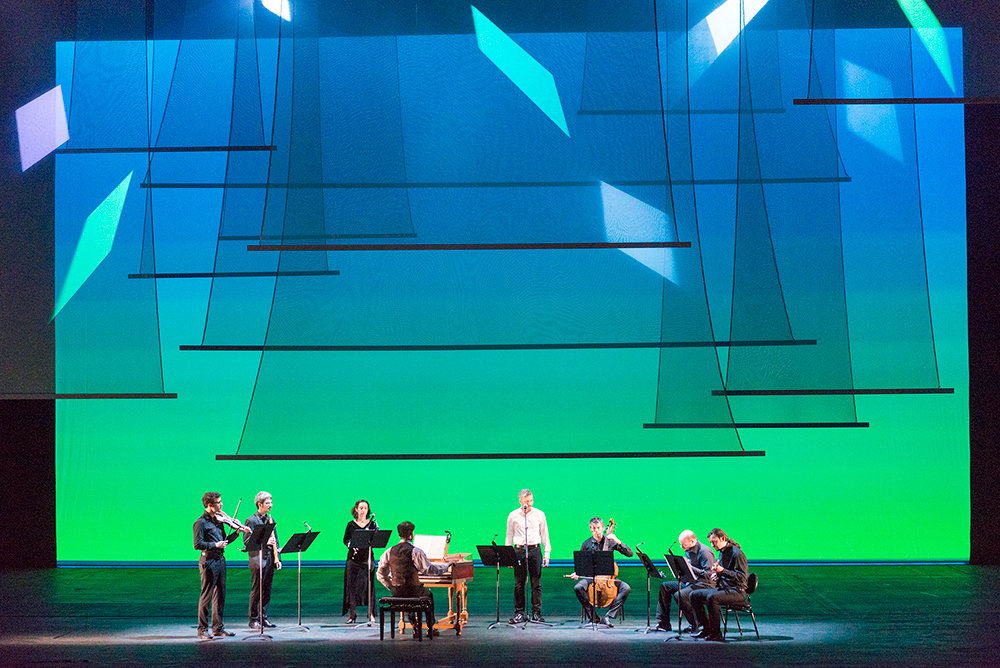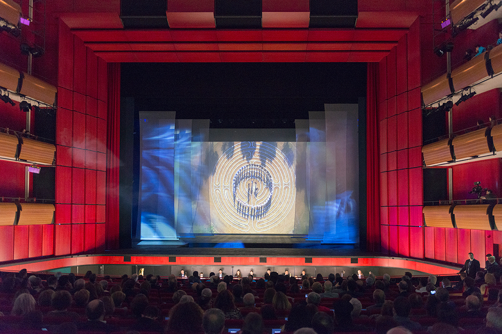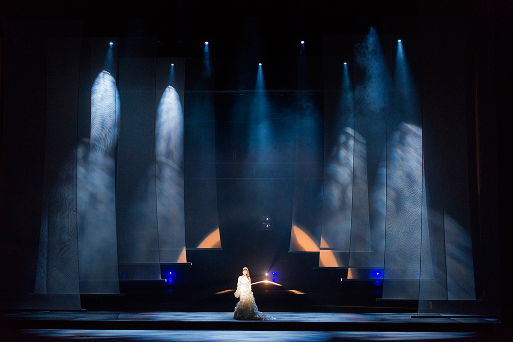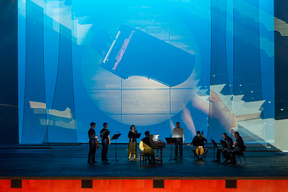 The installation consists of 15 large scale projection screens of different sizes (ten screens 5x15m, one screen 6x15m, one screen 8x15m, one screen 10x15m, one screen 12x15m) that are custom-made out of translucent fabric especially specified to allow simultaneous front and back video projection. They are placed inside the full depth of the Opera House stage, overlapping each other and therefore capturing inside their core a 3dimensional effect, the ghost image of the events that are simultaneously taking place in various areas of the Stavros Niarchos Foundation Cultural Center. Abstract volumetric holograms occur. The screens and their locations are especially designed to be individually moving vertically and therefore to be transforming every next environment that captures a completely different event.